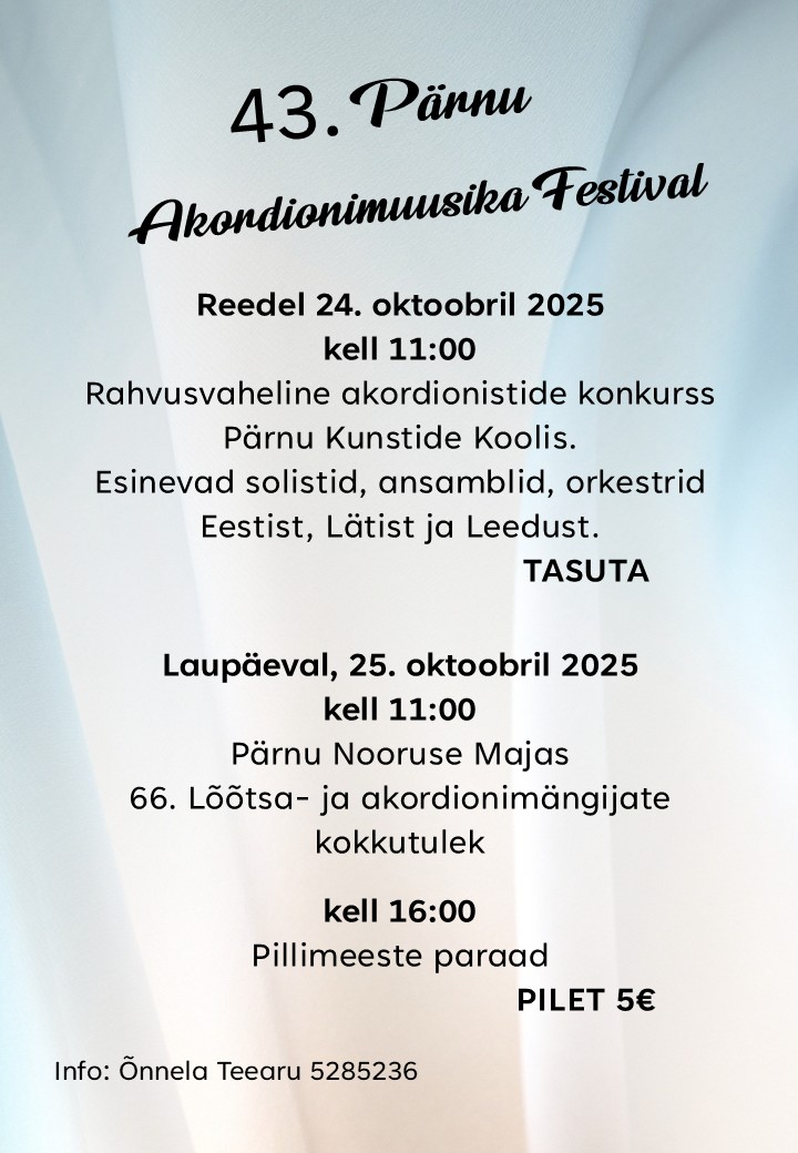 Reedel, 24. oktoobril kell 11.00 toimub Pärnu Kunstide Koolis rahvusvaheline akordionistide konkurss.