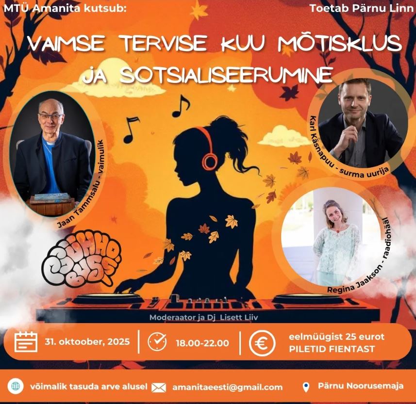 MTÜ Amanita kutsub kõiki huvilisi 31. oktoobril Pärnu Nooruse majja seminarile ja sotsialiseerumise õhtule „Vaimse tervise kuu mõtisklus“. Seminari eesmärk on suurendada osalejate teadlikkust ja enesekindlust vaimse tervise teemadel, pakkudes teadmisi, tuge ja inspireerivaid kogemusi. Üritus toob kokku spetsialistid ja kogukonna liikmed, et jagada teadmisi, arutada vaimse tervise hoidmise võimalusi ning leida uusi vaatenurki igapäevase heaolu toetamiseks. Üritusele on oodatud kõik Pärnu elanikud ja linna külastajad.