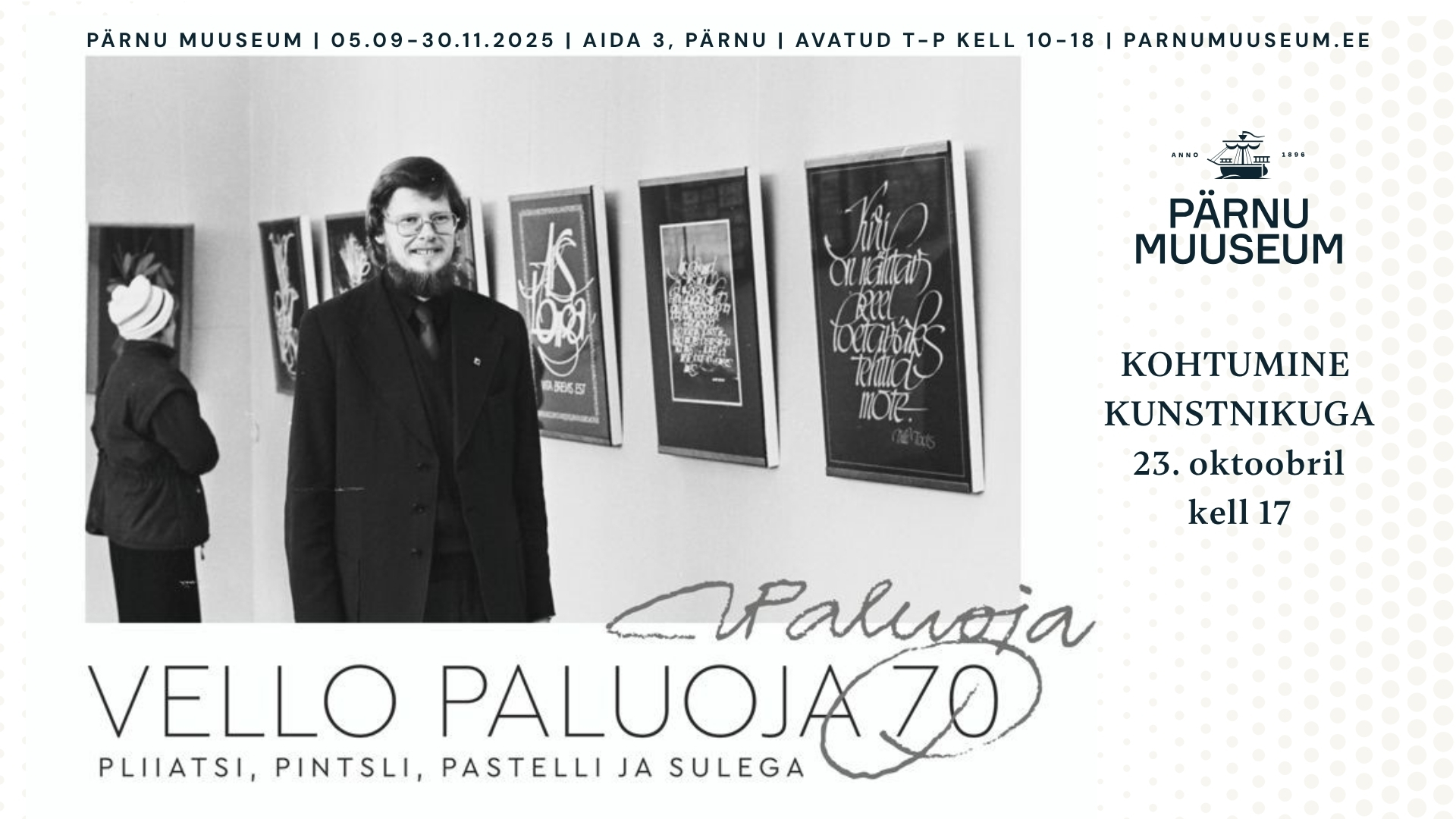 Retrospektiivnäitus "Vello Paluoja 70. Pliiatsi, pintsli, pastelli ja sulega" tutvustab Paluoja teoseid läbi mitme aastakümne, tehnika ja loomeperioodi. Pea igal tükil on oma huvitav lugu või on seotud põneva seigaga kunstniku eluloost. Just nende lugude kuulamiseks kohtume 23. oktoobril kell 17.00 kunstniku endaga. Publikul on võimalik küsida küsimusi ning leida uusi sügavusi väljapanekule jõudnud tööde taga.