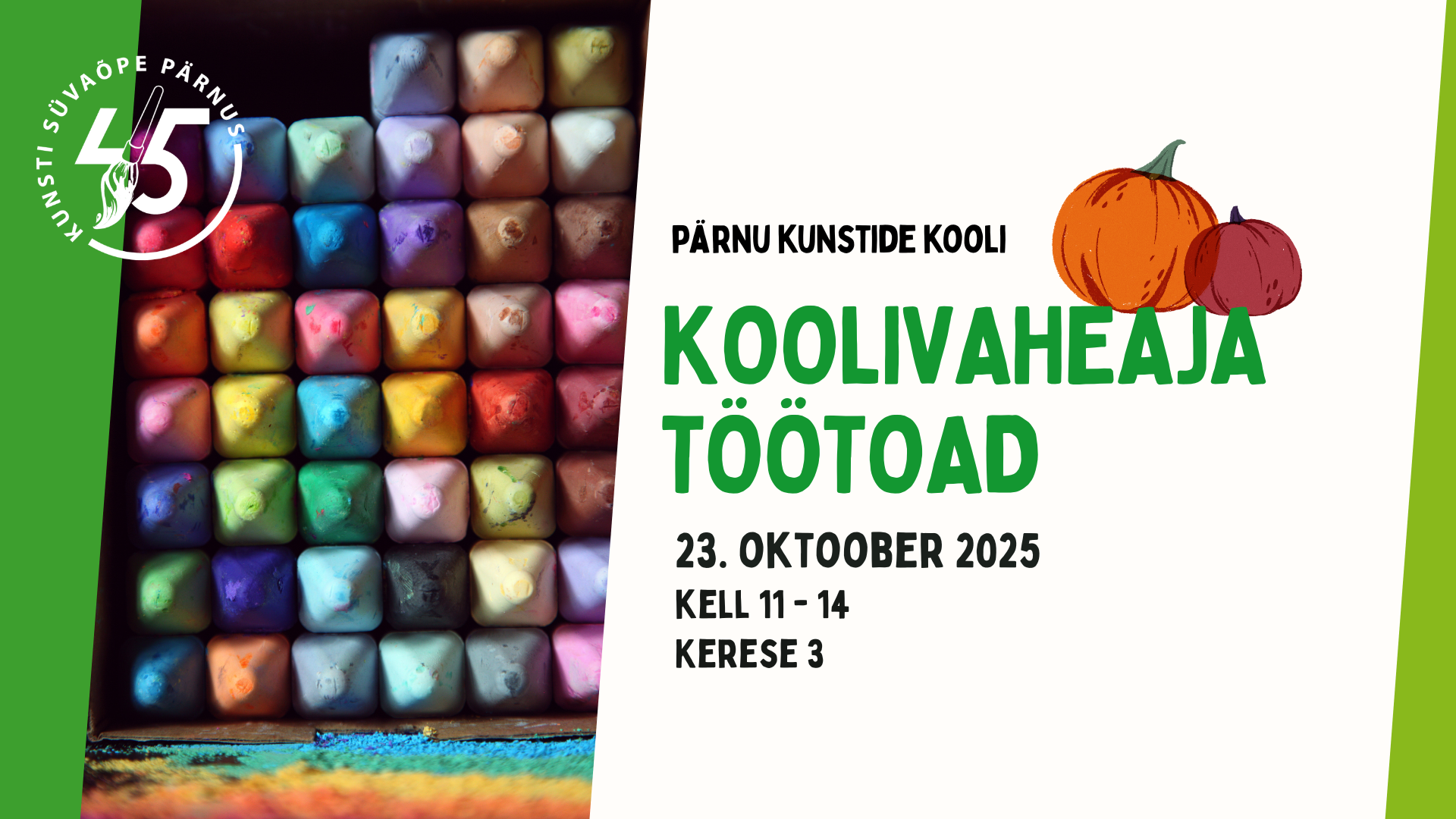 Pärnu Kunstide Kooli sügisvaheaja töötoad lastele ja noortele on avatud üle terve maja, saab maalida, joonistada ja meisterdada. Kõik töötoad algavad täistunnist, sobiva tunniga saab liituda jooksvalt. Juhendavad erinevad kunstiõpetajad.