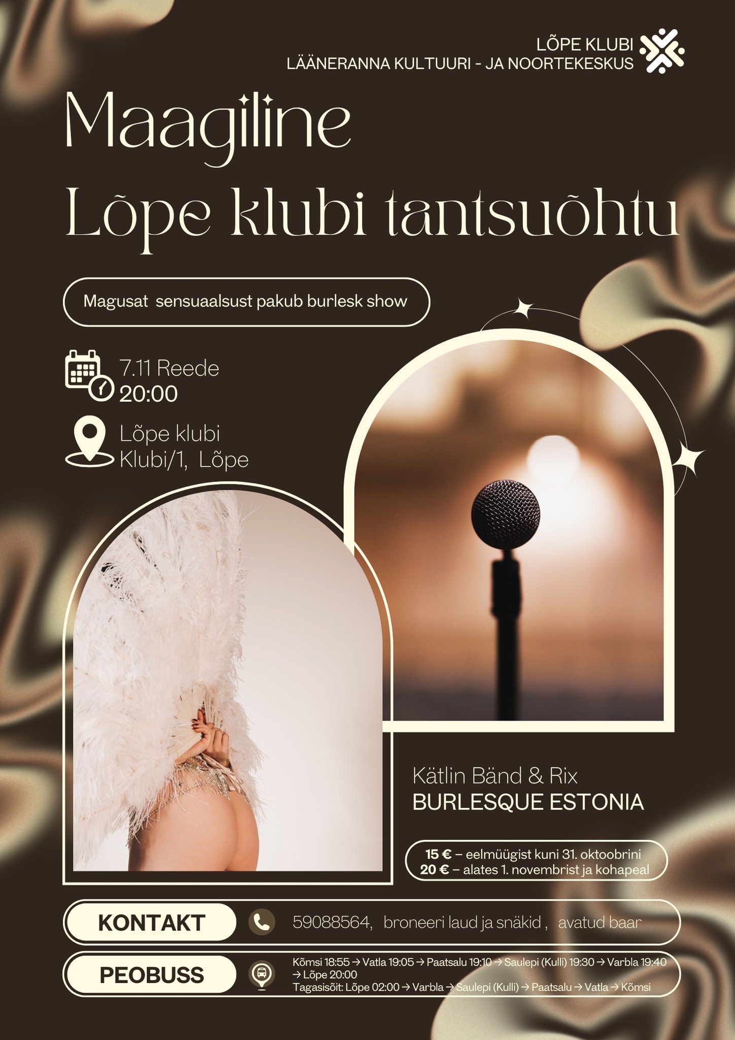 Lase end kanda säravasse öösse, kus elegants kohtub sensuaalsusega. Lõpe klubi muutub üheks õhtuks unustamatuks peopaigaks, kus sind ootab: