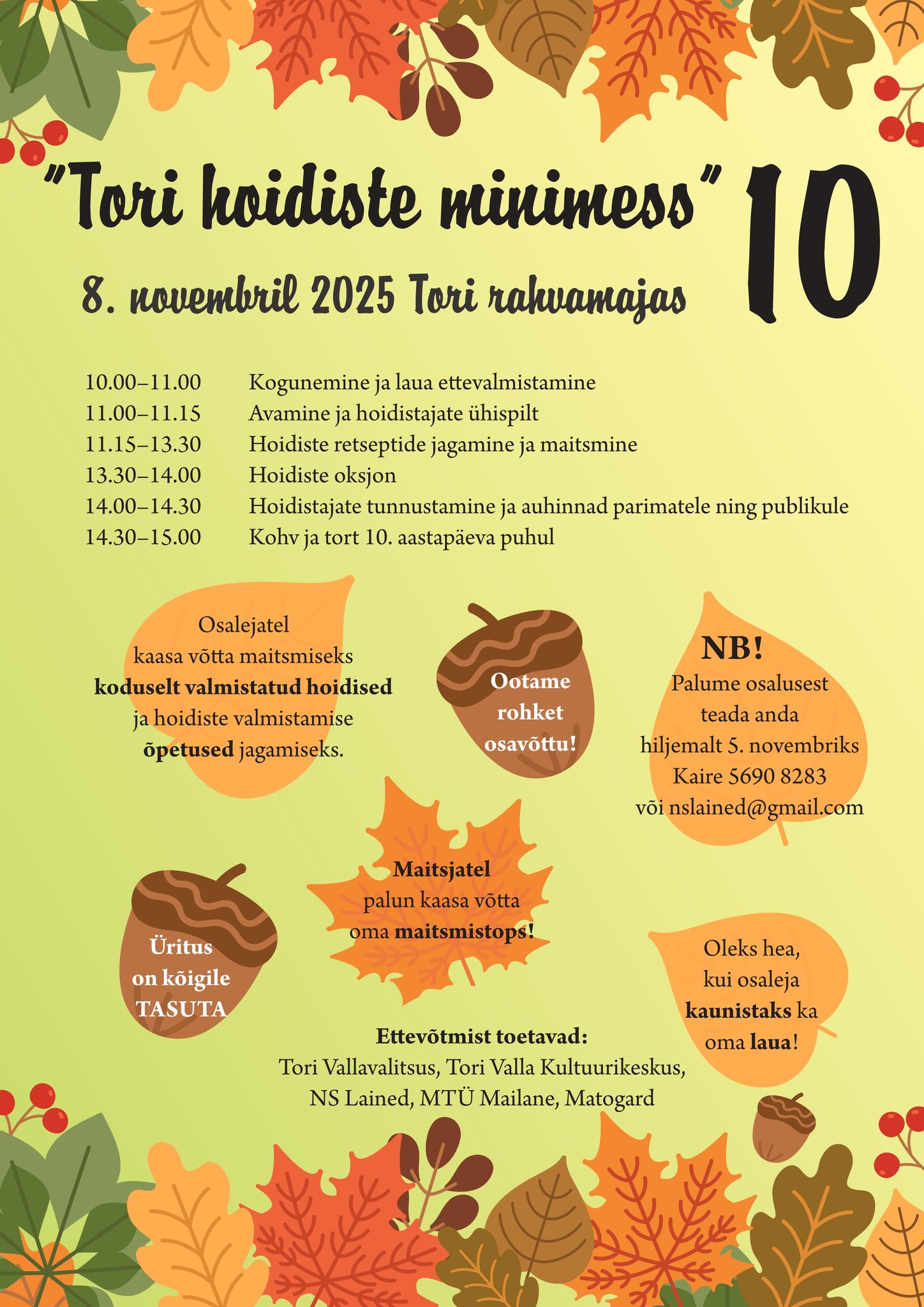 Palume osalemisest teada anda hiljemalt 5. novembriks: Kaire, 5690 8283, nslained@gmail.com