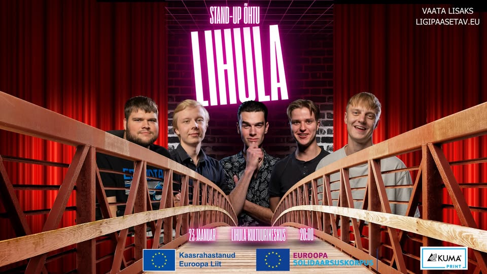 Lihula kultuurimajas toimub 23.jaanuar Euroopa Liidu poolt kaasrahastatud projekti “Ligipääsetav stand-up” raames tasuta stand-up õhtu, mille eesmärk on viia kaasaegne huumor ka nendeni, kes tavaliselt suurtesse keskustesse kultuuri nautima ei satu. Lihula ja teie hubane kultuurimaja sobivad selleks ideaalselt – oodata on ainulaadset ja meeldejäävat õhtut!