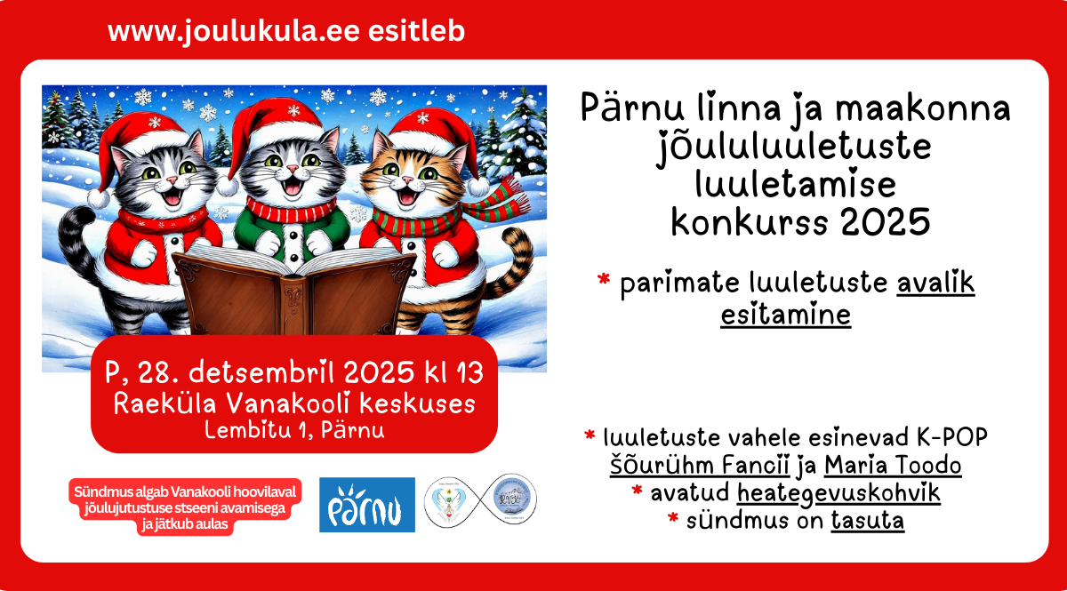 www.joulukula.ee esitleb Pärnu linna ja maakonna jõululuuletuste luuletamise 2025. aasta konkursi tulemusi pühapäeval, 28. detsembril kell 13 Raeküla Vanakooli keskuses. Luuletuste vahele esinevad K-POP šõurühm Fancii ja Maria Toodo. Avatud on heategevuskohvik.