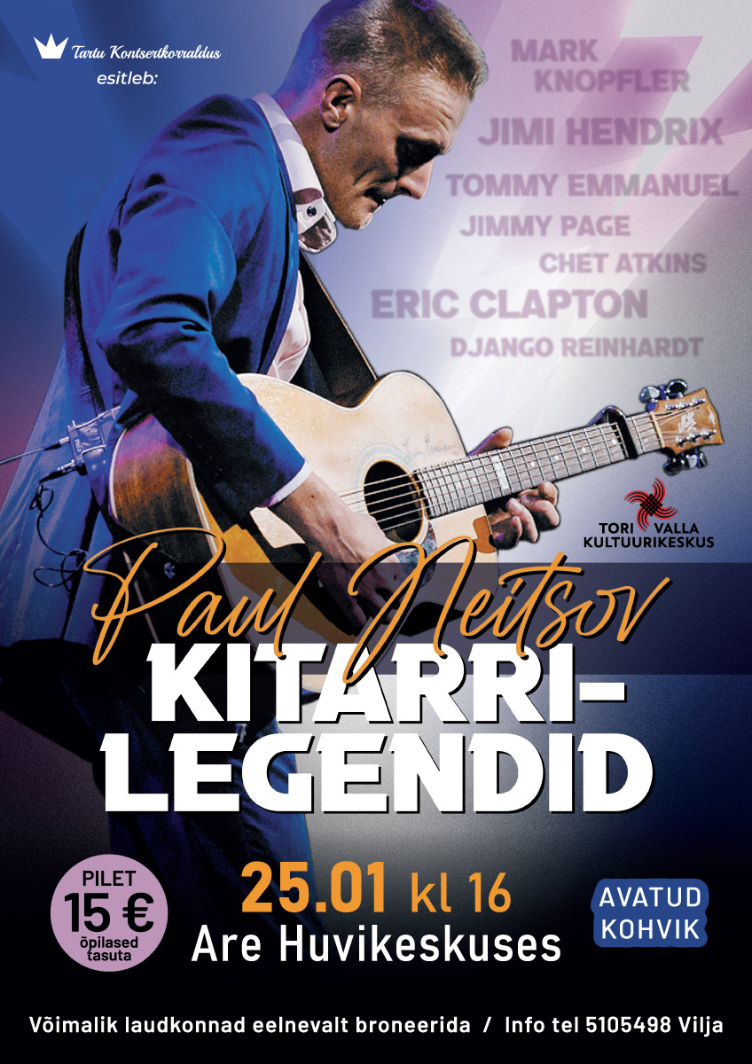 🎸 Paul Neitsov – Kitarrilegendid 🎸 📍 Are Huvikeskuses 🗓 25. jaanuaril ⏰ algus kell 16.00 Tartu Kontserdikorraldus esitleb: kitarrivirtuoos Paul Neitsov viib publiku rännakule läbi kitarrimuusika ajaloo, kõlama saavad palade ja stiilide kaudu legendid nagu Mark Knopfler, Jimi Hendrix, Tommy Emmanuel, Jimmy Page, Chet Atkins, Eric Clapton ja Django Reinhardt. See on kontsert, kus kohtuvad meisterlik pillikäsitlus, tuntud meloodiad ja haaravad lood kitarrimuusika suurkujudest 🎶 ☕️ Avatud kohvik 🎟 Pilet 15 € (õpilastele tasuta) 🪑 Võimalik laudkonnad eelnevalt broneerida ℹ️ Info ja broneerimine: Vilja, tel 510 5498 Oodatud on kõik kitarrimuusika sõbrad – elamus, mis pakub nii äratundmisrõõmu kui ka uusi avastusi! 🎵