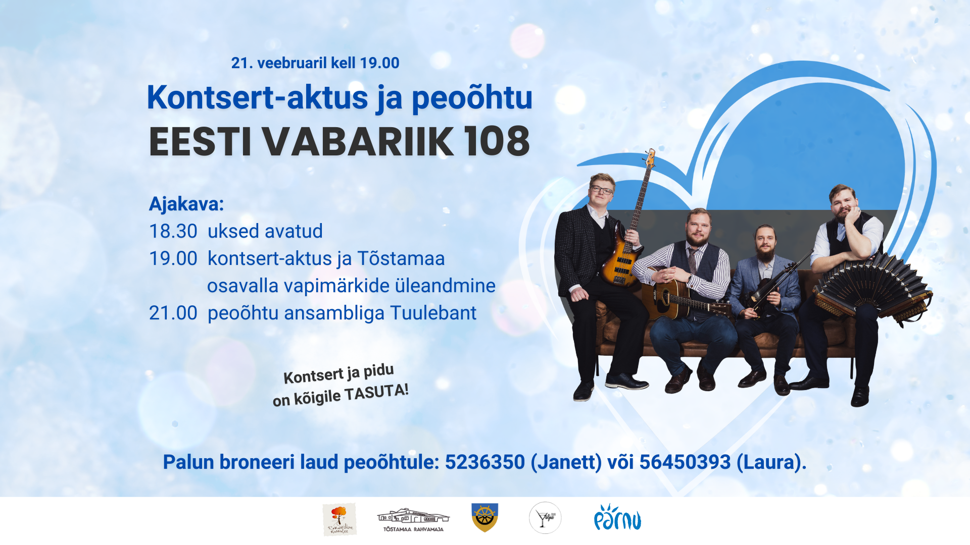 Laupäeval, 21. veebruaril kutsume Tõstamaa rahvamajja Eesti Vabariigi kontsert-aktusele ja peoõhtule.
