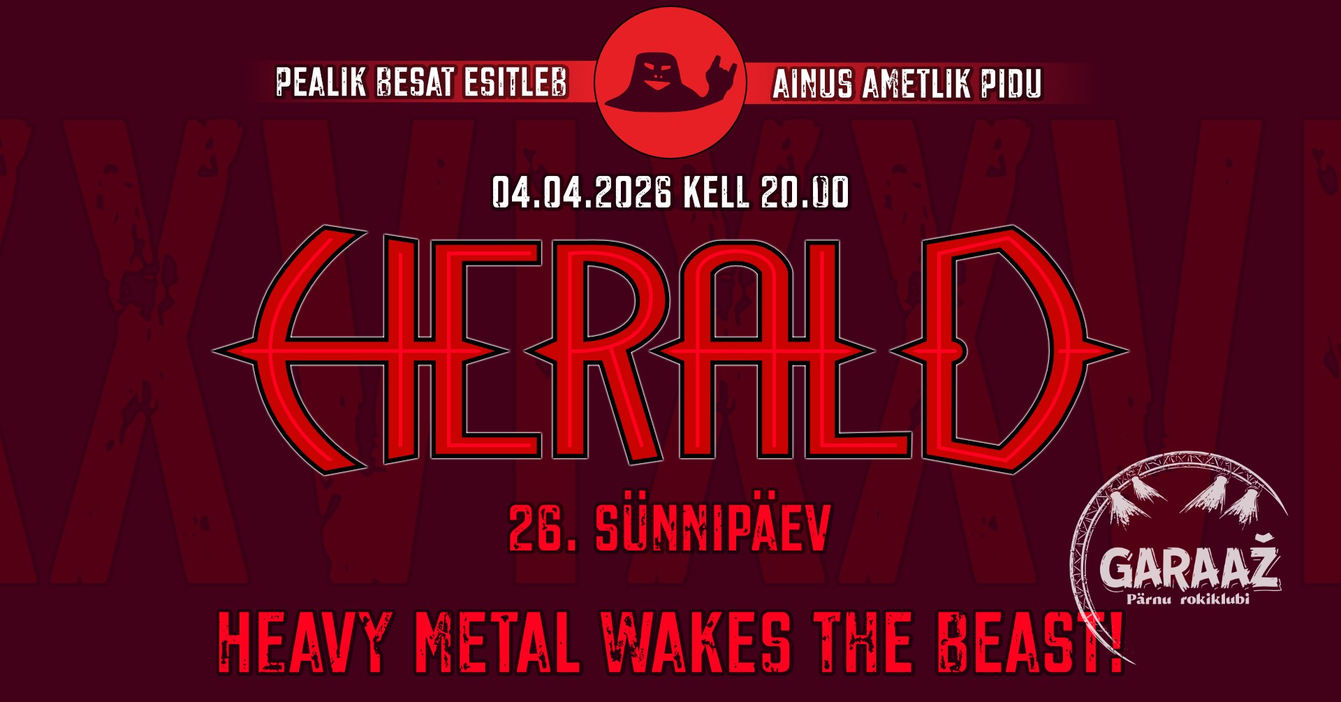 Legendaarne Eesti hevibänd HERALD, kes tähistas eelmisel aastal 25 aasta juubelit, jätkab oma iga-aastaste väiksemate sünnipäevapidude traditsiooni. Seekord annab bänd ainsa ametliku tähtpäevakontserdi Pärnus rokiklubis Garaaž. Pärnusse on bänd aja jooksul sattunud pigem harva ja värskes klubis Garaaž esinetakse esmakordselt. Kuna maja pole kummist, tasub piletid kindlasti eelmüügist ära osta.