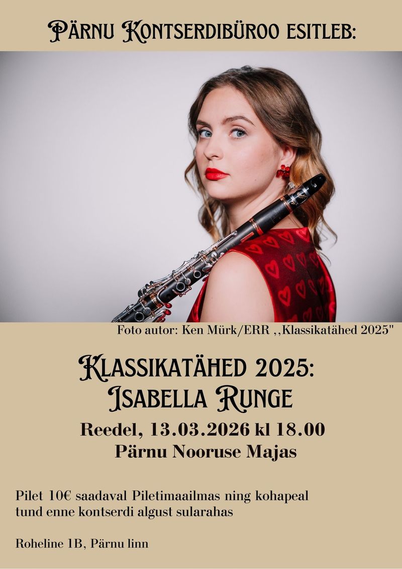 Pärnu Nooruse Majas on 13.03 kl 18.00 klassikalise muusika huvilistel võimalus kuulata telekonkursil ,,Klassikatähed 2025” osalenud klarnetist Isabella Runge esituses klassikalise muusika heliloojate paremikku.