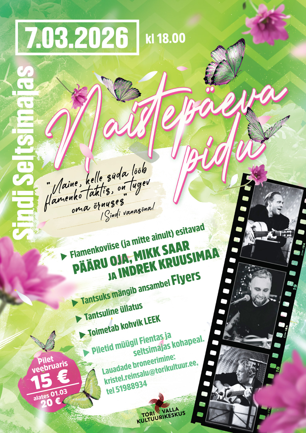 🌸✨ Naistepäeva pidu Sindi Seltsimajas ✨🌸 🗓 7. märts 2026 🕕 kell 18.00 📍 Sindi Seltsimaja Tähistame naistepäeva mõnusa muusika, tantsu ja hea seltskonnaga! 💃🕺 Õhtu toob lavale kirglikud rütmid ja flamenkoviisid ning palju üllatusi. 🎶 Esinevad: 🔹 Pääru Oja 🔹 Mikk Saar 🔹 Indrek Kruusimaa 💃 Tantsuks mängib ansambel Flyers 🎉 Tantsuline üllatus ☕ Avatud on kohvik LEEK 🎟 Piletid: ▪️ Veebruaris 15 € ▪️ Alates 01.03 – 20 € 👉 Piletid müügil Fientas ja Sindi Seltsimajas kohapeal 📞 Laudade broneerimine: kristel.reinsalu@torikultuur.ee tel 51988934 Tule tähista naistepäeva stiilselt ja meeleolukalt! 🌷💖