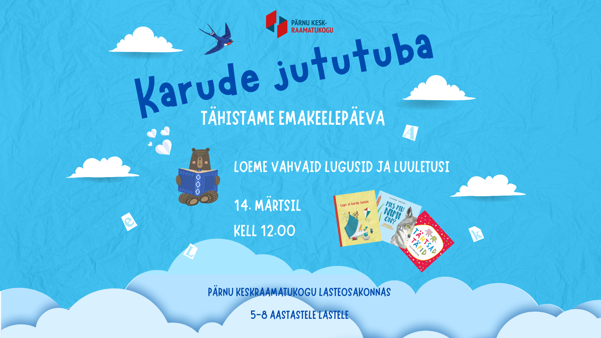 Emakeelepäeval, 14. märtsil kell 12.00 ootab Pärnu Keskraamatukogu 2. korrusel lasteosakonnas Karude jututuba 5-8 aastaseid raamatusõpru lugusid kuulama ja mõistatama!