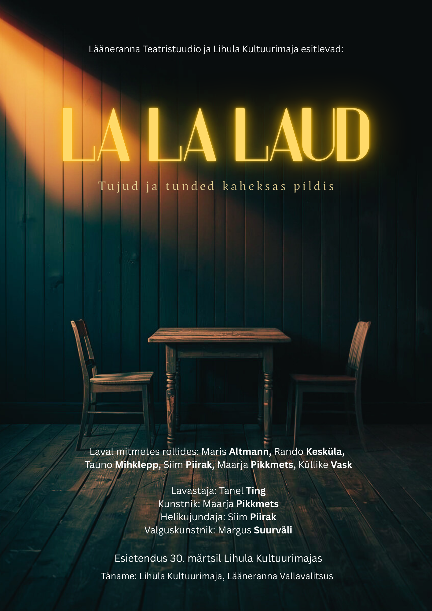 Lääneranna Teatristuudio lavastus “La La Laud” on loodud koos trupiga ja on esimene lavastus, mis publiku ette jõuab. Lavastuse loomisel ei olnud fookuses lugu, vaid näitlejad. Lavastajana proovisin pakkuda igale teatristuudio liikmele kogemust, millega saab tunda peategelase rolli ja nii sündis ka lavastus, mis koosneb kaheksast erinevast lühikesest loost, kus iga näitleja saab kehastada mitut erinevat rolli. Läbi nende rollide sünnivad laval erinevad elulised lood, mis igaühele äratundmisrõõmu või -valu võiksid pakkuda.